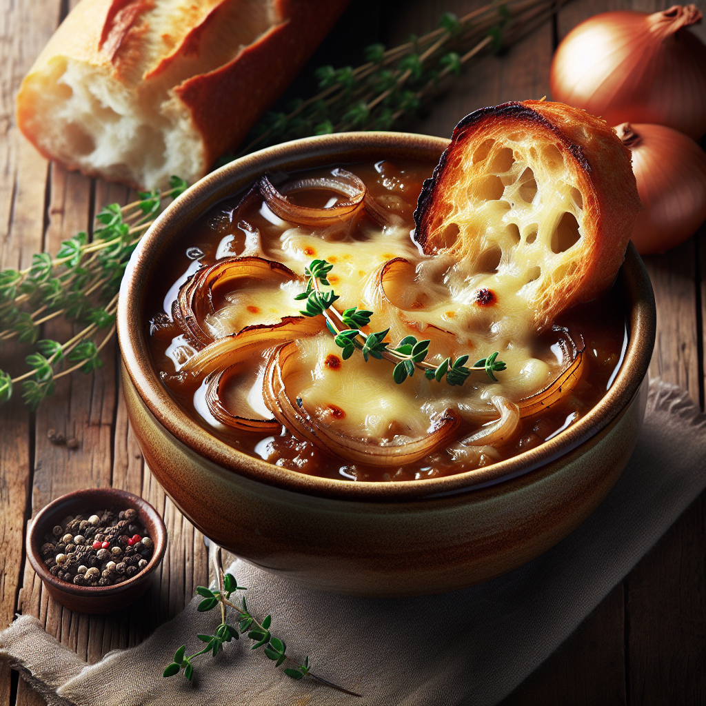 This classic French Onion Soup is a delightful combination of sweet caramelized onions and rich beef broth, topped with a crusty slice of toasted baguette and melted Gruyère cheese. Perfect for a cozy night in, this timeless dish brings a touch of French elegance to your table.